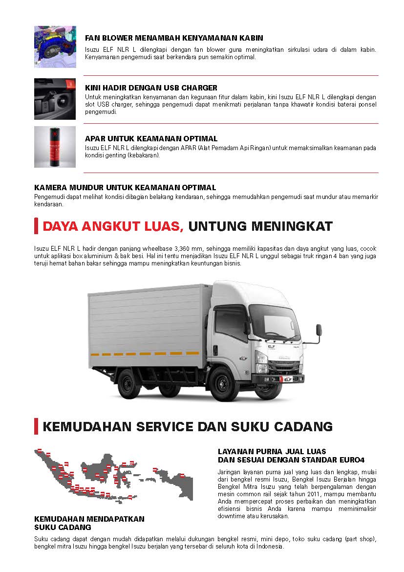 Dengan Engine Control Unit (ECU) yang terdapat pada mesin common rail, kini Isuzu ELF NLR mampu menghasilkan tenaga dan torsi yang lebih besar (120 PS/2.600 rpm dan 36 kg.m/1.500 rpm) namun lebih irit dan mampu mengoptimalkan efisiensi bisnis Anda.