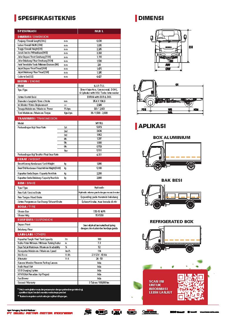 Hadir dengan panjang wheelbase 3,360 mm, sehingga memiliki kapasitas dan daya angkut yang luas, cocok untuk aplikasi box alumunium & bak besi. Hal ini tentu menjadikannya unggul sebagai truk ringan 4 ban yang juga teruji hemat bahan bakar sehingga mampu meningkatkan keuntungan bisnis.