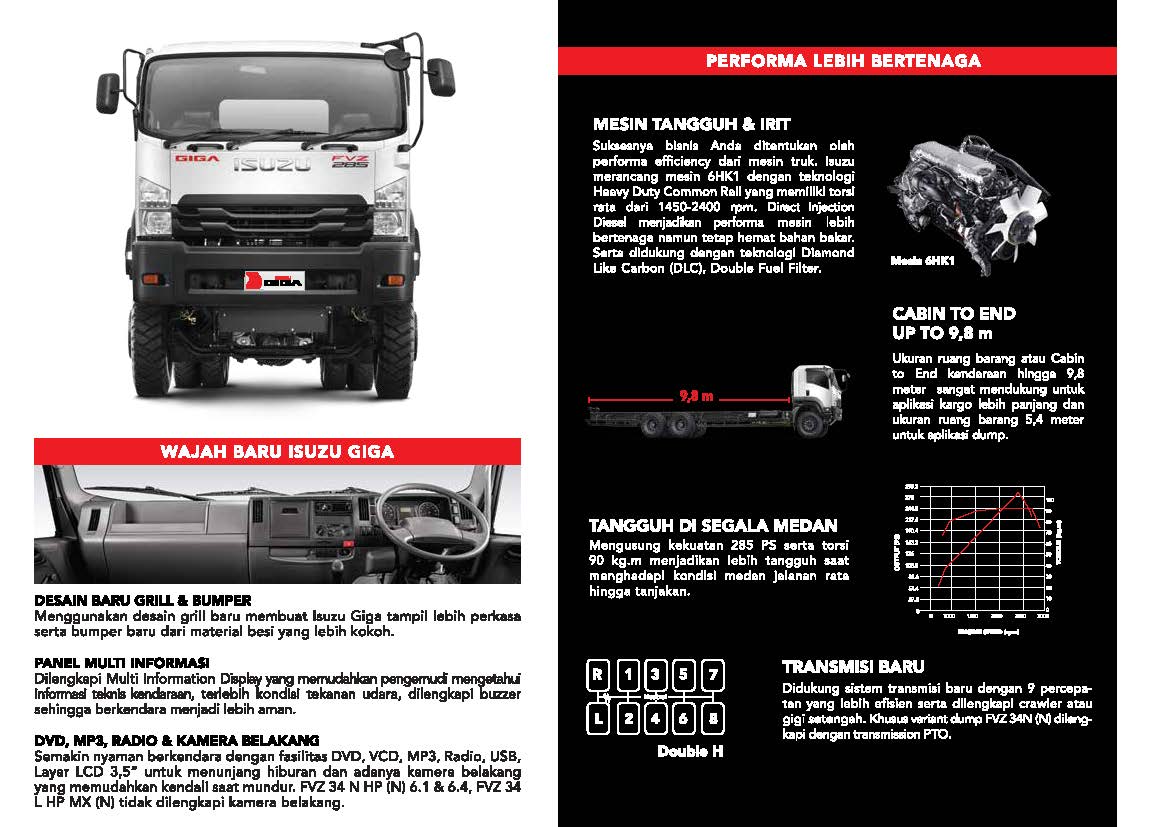 Isuzu GIGA FVZ yang memiliki 3 varian andalan, dibekali dengan teknologi mesin Heavy Duty Common Rail 6HK1-TCS yang dilengkapi Exhaust Gas Recirculation (EGR) dan Diesel Oxidation Catalyst (DOC), sehingga mampu menghasilkan emisi gas buang berstandar EURO4, dengan tenaga 285 PS. Truk tangguh dengan performa tinggi ini turut dibekali Direct Injection Diesel dengan teknologi Diamond Like Carbon (DLC) dan Double Fuel Filter.
