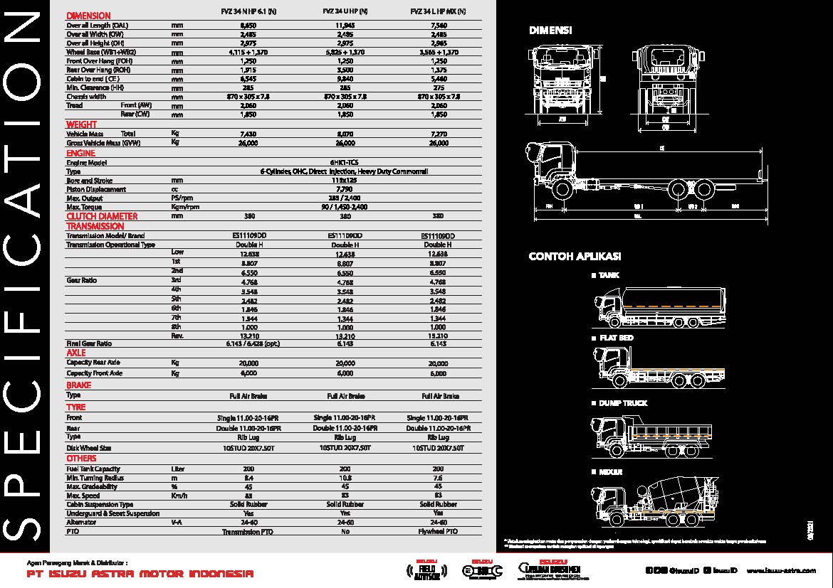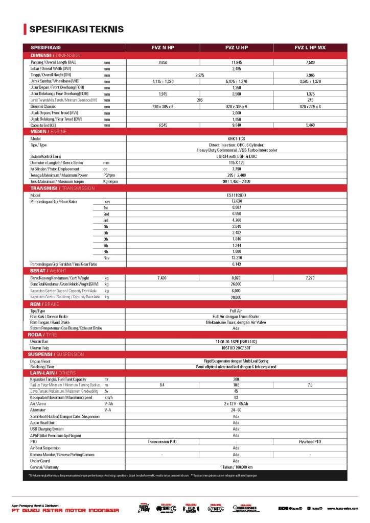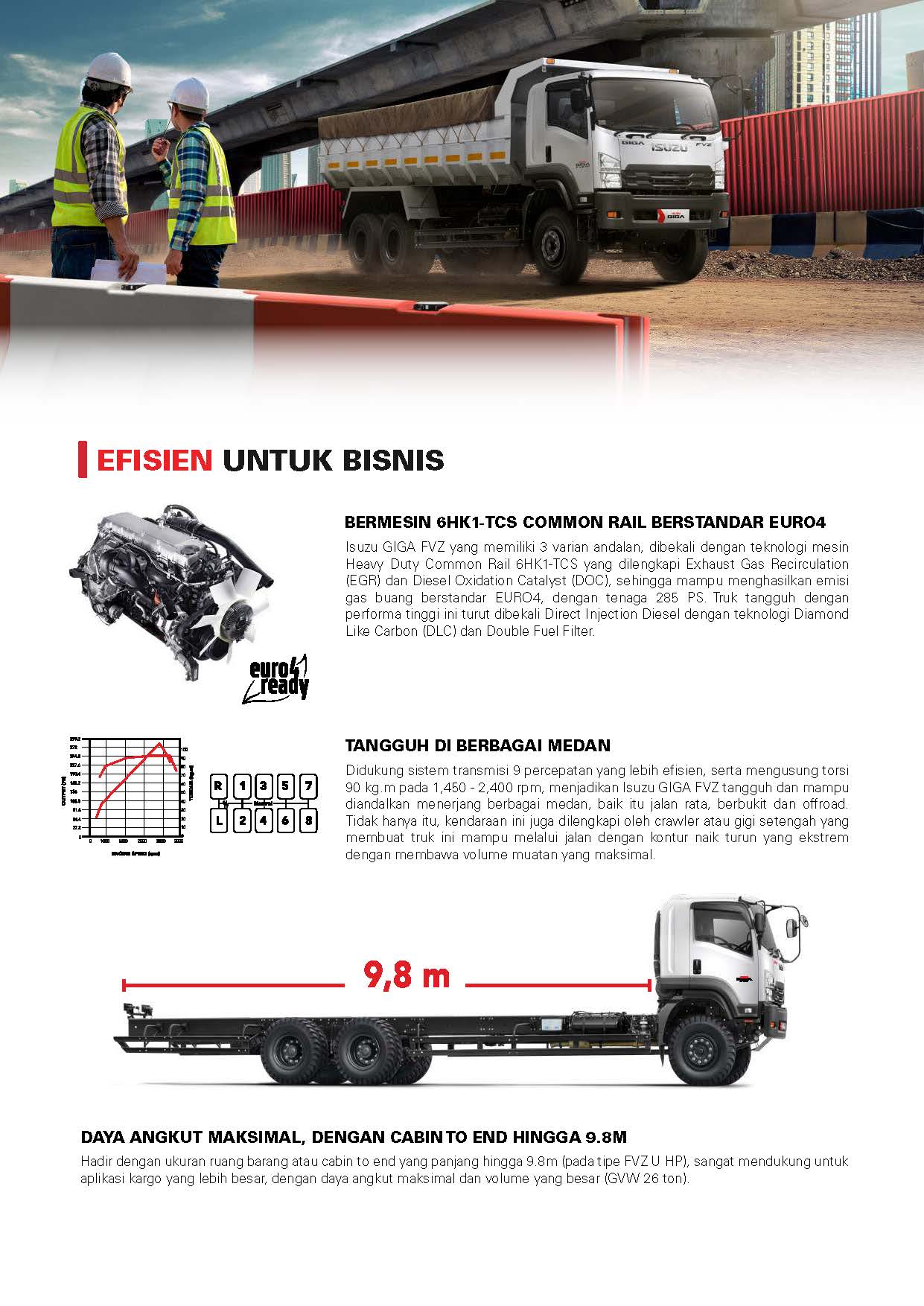 Hadir dengan ukuran ruang barang atau cabin to end yang panjang hingga 9.8m (pada tipe FVZ U HP), sangat mendukung untuk aplikasi kargo yang lebih besar, dengan daya angkut maksimal dan volume yang besar (GVW 26 ton).